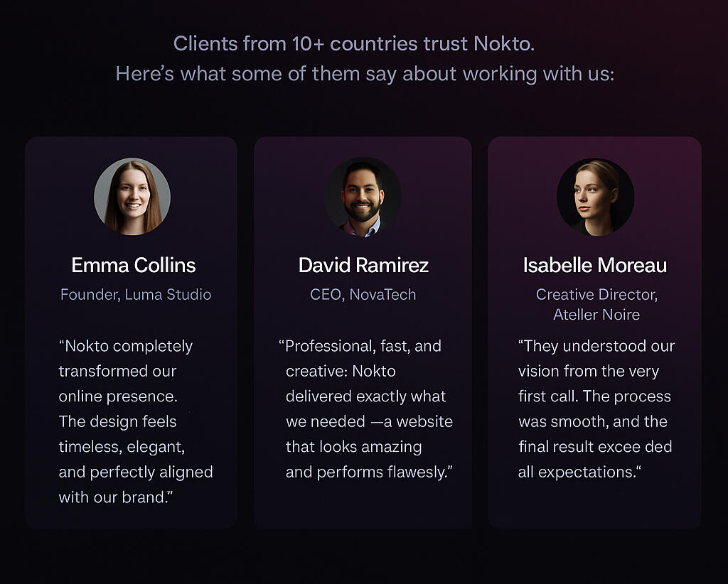 At Nokto, we design and build modern, user-focused websites that help brands grow online. We believe that great design is not just about visuals — it’s about creating digital experiences that are clear, intuitive, and meaningful.Our studio works with small businesses, startups, and creatives worldwide, delivering custom web design, branding, and UX solutions tailored to each client’s goals.